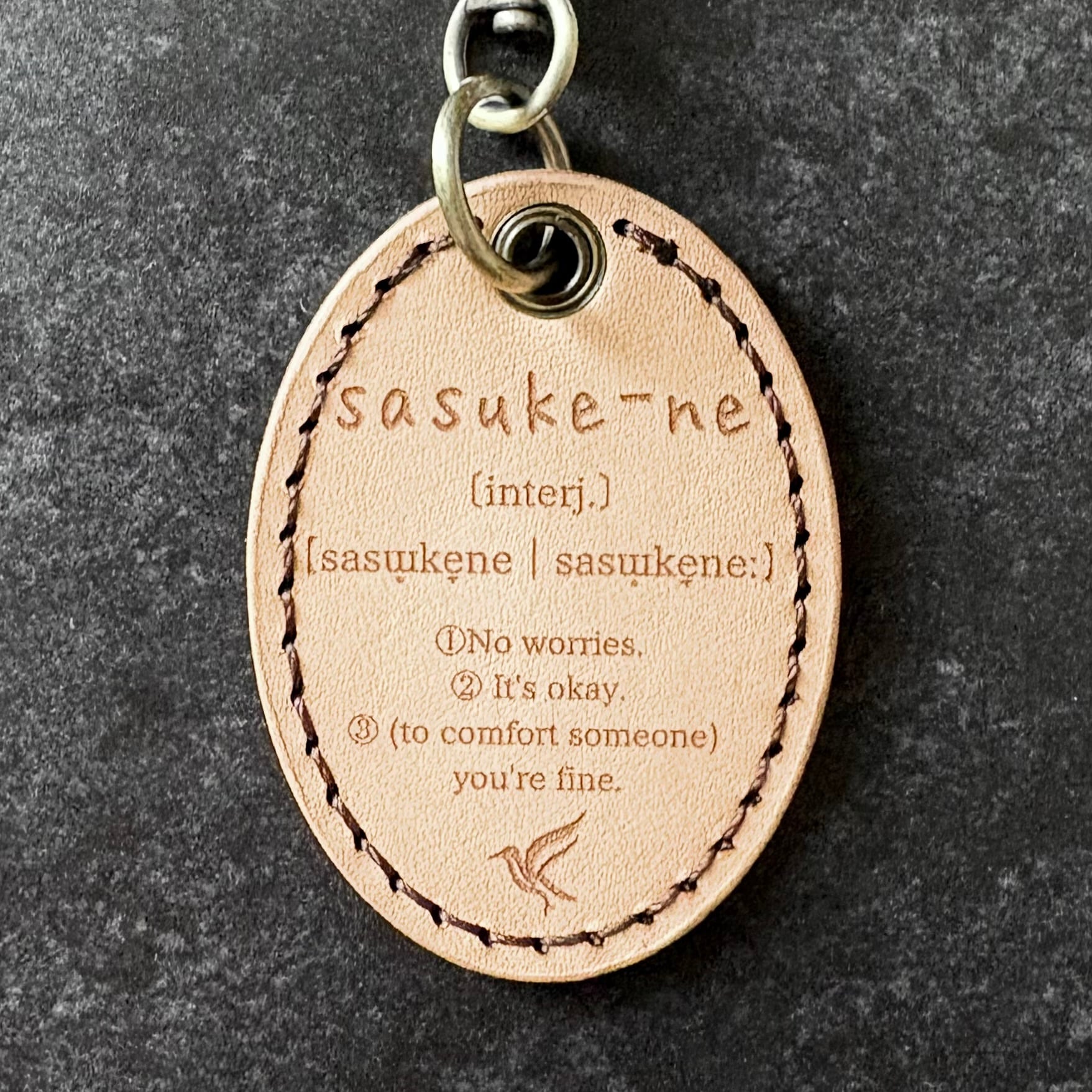 会津弁「さすけね〜」と、ほっとする表情の赤べこを刻んだレザーキーホルダーです。